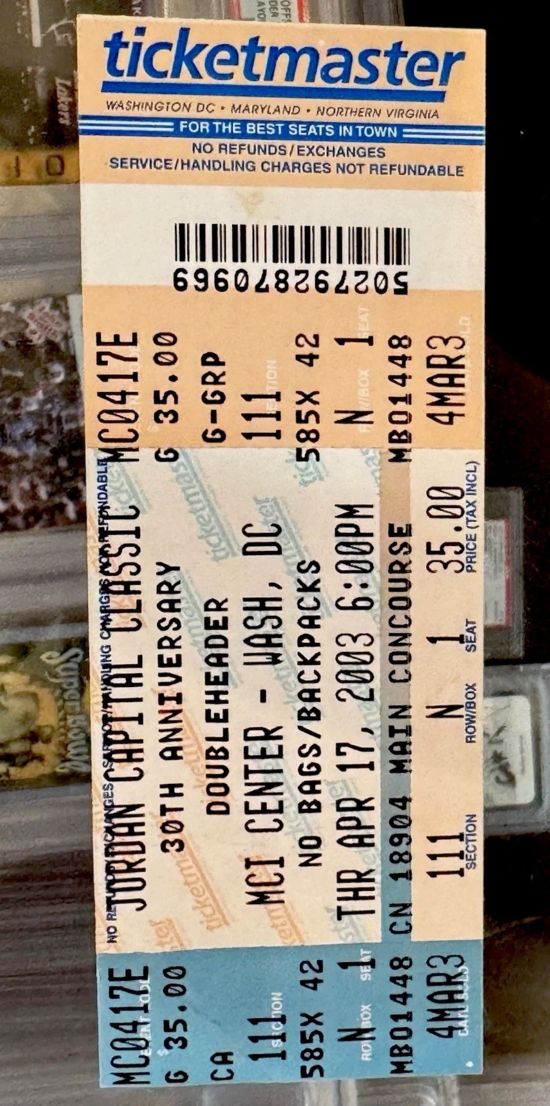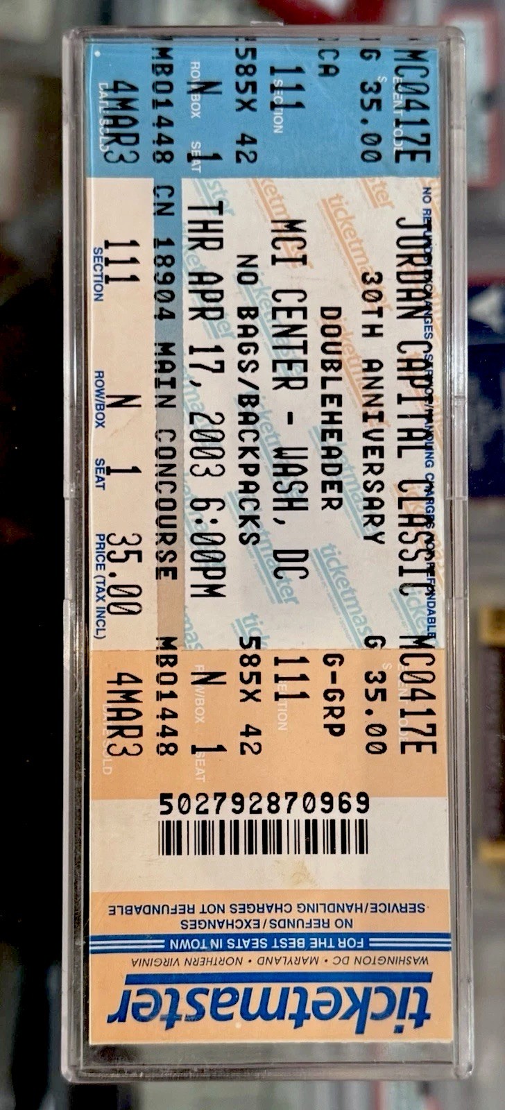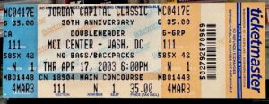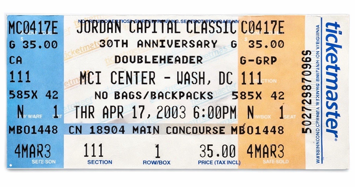 Vintage basketball ticket, On April 17, 2003, 18-year-old LeBron James earned co-MVP honors at the 30th annual Jordan Capital Classic in Washington, D.C.. Playing for the Black Team, James recorded 34 points and 12 rebounds.