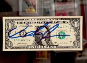 Up for sale is an incredible piece of sports memorabilia – a U.S. $1 Dollar Bill signed by NBA Hall of Famer Denis Rodman, also known as “The Worm.” Rodman is regarded as one of the greatest rebounders and defenders in NBA history, a 5-time NBA Champion, 2-time Defensive Player of the Year, and an essential part of the Chicago Bulls dynasty alongside Michael Jordan and Scottie Pippen.