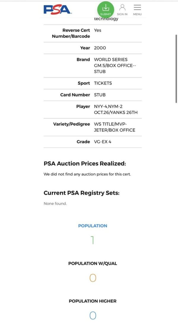 Derek Jeter MVP (PSA) 2000 World Series GM5 Yankees & Mets Game Clincher / Only 1 in Population