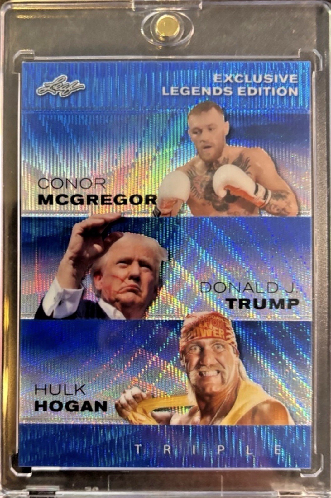 Offered here is a rare 2024 Leaf Legends Edition “Triple” card, featuring three of the most recognizable and polarizing figures across politics, MMA, and professional wrestling: