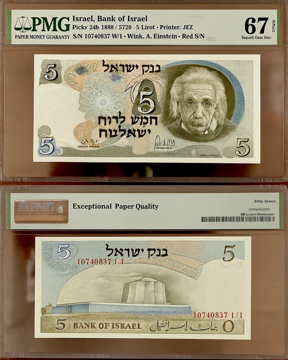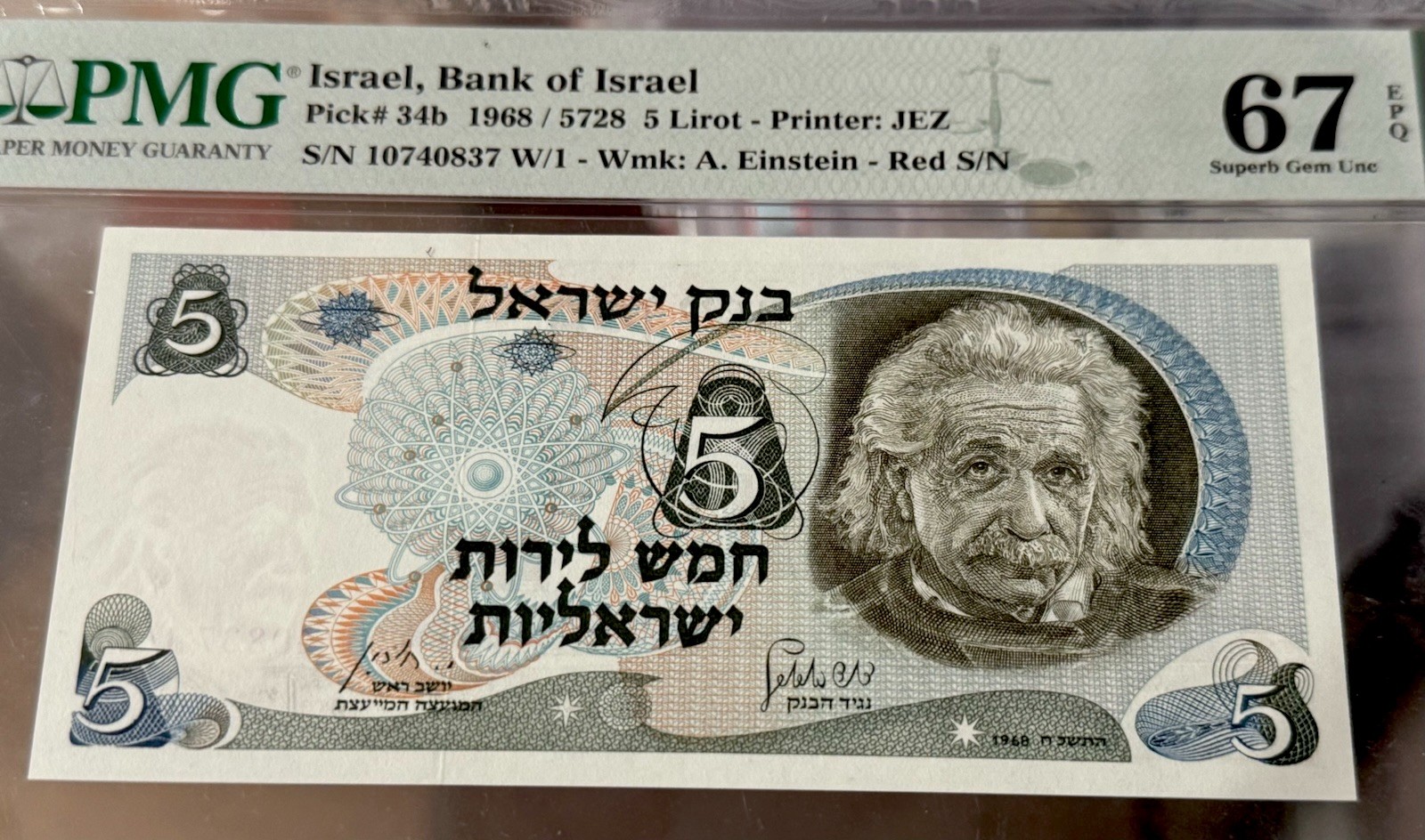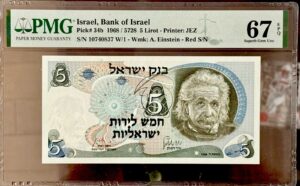 1968 Israel 5 Lirot – Albert Einstein Note – PMG 67 EPQ – Rare & Superb Gem!