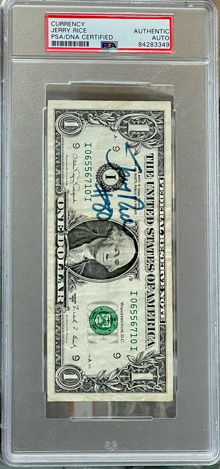 Jerry Rice Signed Currency #80 (PSA) Encapsulated Authentic Autograph. Blue Ink on a $1 Dollar Bill/ George Washington.