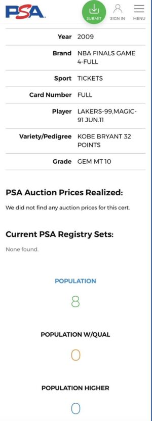 Kobe Bryant (PSA 10) GEM-MINT FULL-Ticket 32 Points 2009 Lakers vs Magic NBA Finals