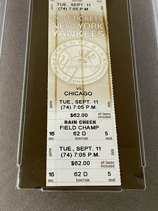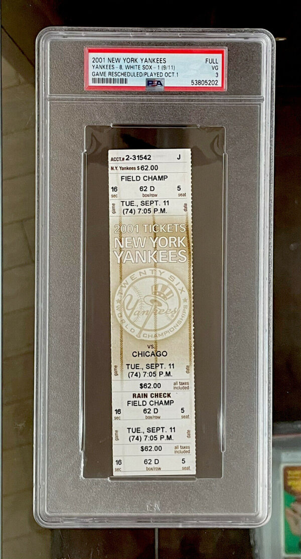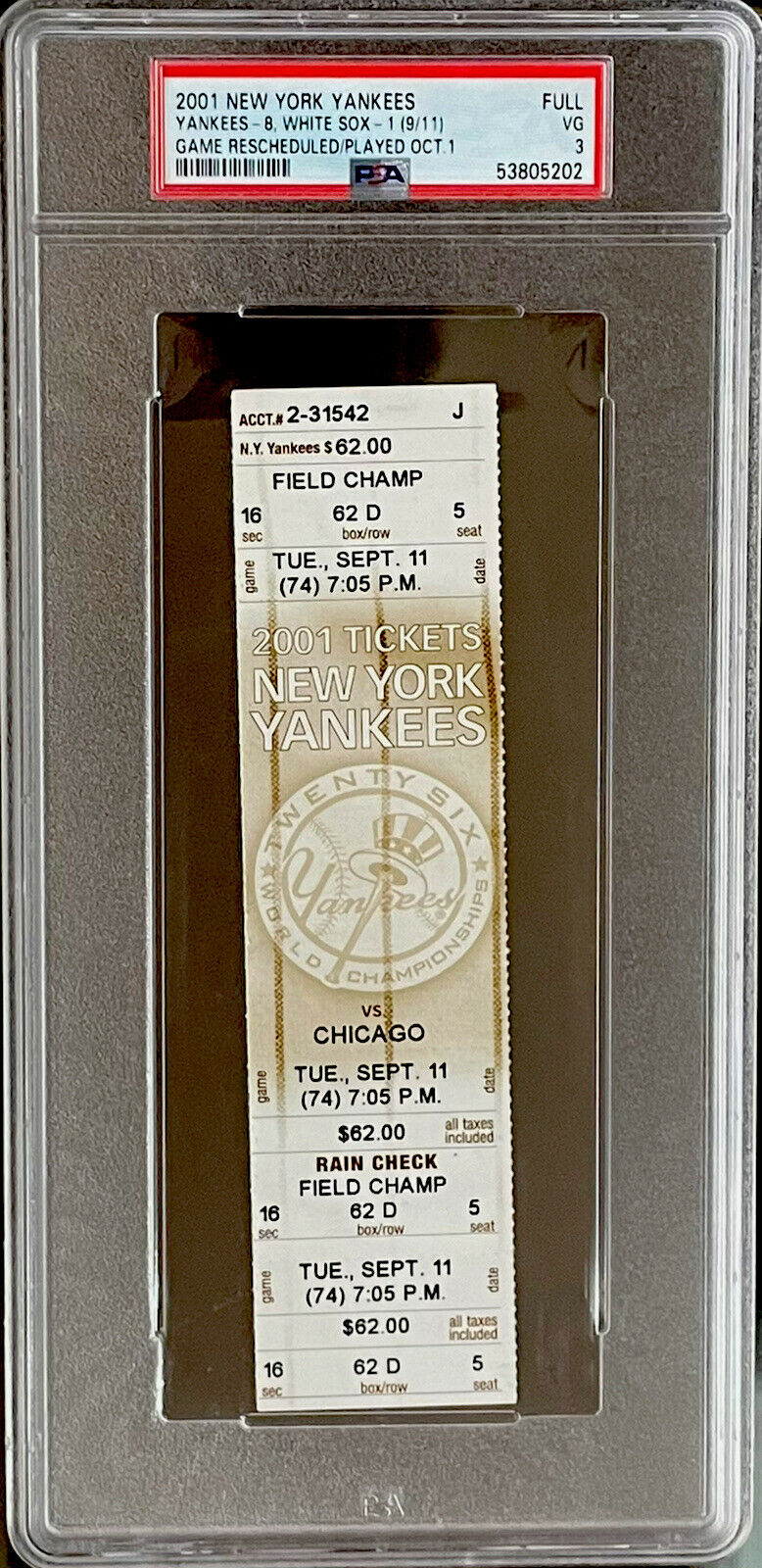 Own a piece of American History, 9/11 2001 New York Yankees Full Ticket (PSA) Authenticated VG 3, Postponed because of terrorist attack on the twin towers. LOW-POP!